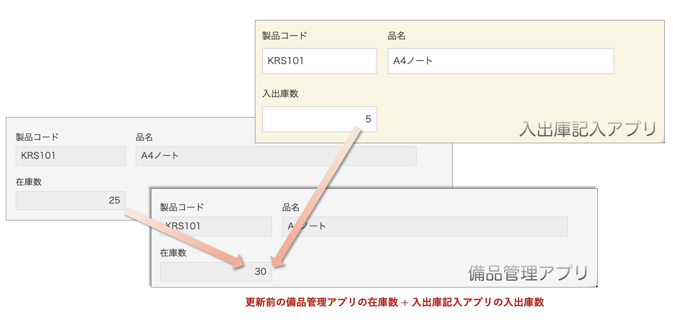 たとえば、在庫数の管理をしている「備品管理アプリ」と入出庫数を記入する「入出庫記入アプリ」を例に説明します。以下の例だと、すでに「備品管理アプリ」のA4ノートは 25 個の在庫があります。そのため、入庫があった際には入庫数の5を「備品管理アプリ」に登録するのではなく、すでに在庫数登録している 25個に入庫数の5個を足す必要があります。