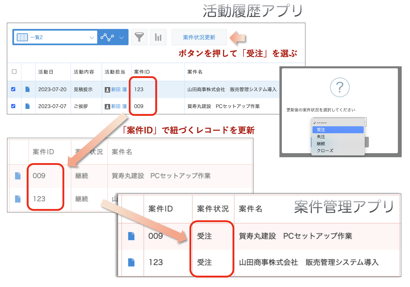 この記事では、「活動履歴」アプリのボタンを押すと、一覧でチェックボックスにチェックしているレコードの案件IDに紐づく「案件管理」アプリの案件状況を、ダイアログで選択した案件状況に一括更新するカスタマイズを作ります。実行例は次のようになります。