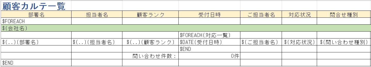 今回は、「顧客管理」アプリのデータ、「問い合わせ管理」アプリのデータがともに繰り返しのデータとなります。そのため、以下のように $FOREACH ~ $END を2箇所に記述します。