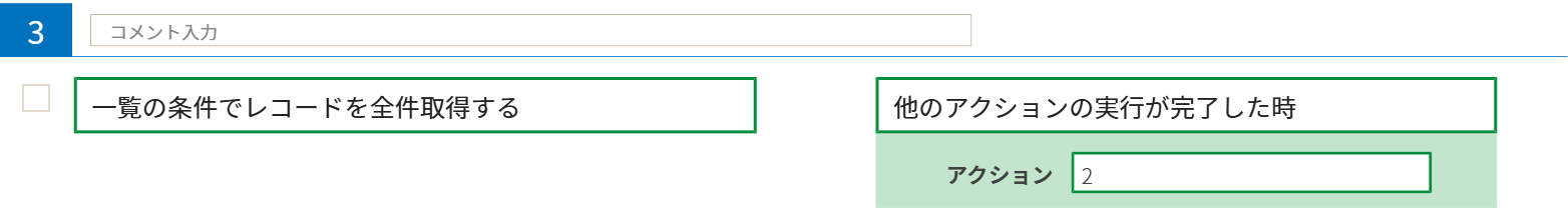 更に、出力対象となるレコードを取得します。今回はやること「一覧の条件でレコードを全件取得する」、条件「他のアクションの実行が完了した時」を使用して、一覧の条件に一致するレコードを取得します。