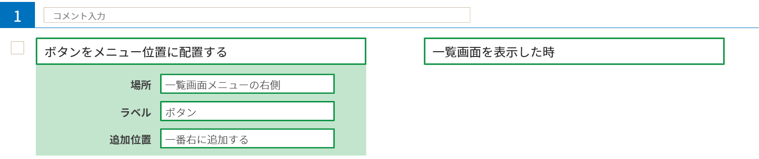 まずは、やること「ボタンをメニュー位置に配置する」、条件「一覧画面を表示した時」を用いて一覧画面表示にボタンを設置します。