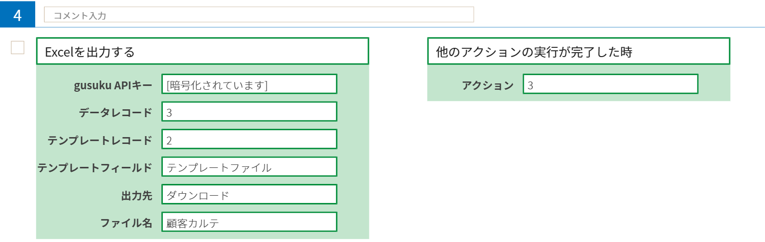 「やること」のパラメータ「gusuku APIキー」には「gusuku API キー取得」の手順に従って取得したキーを登録します。