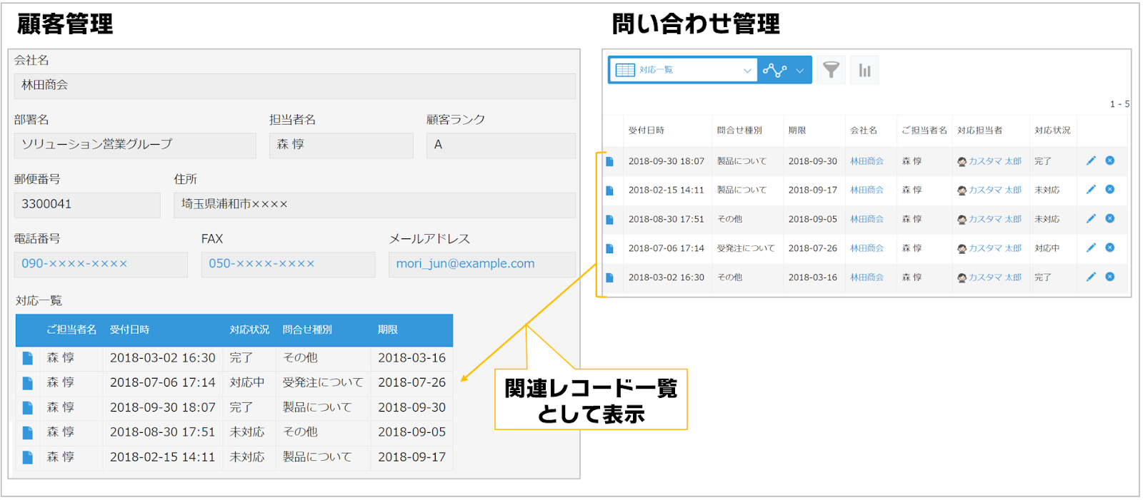 この例では顧客管理アプリに登録されている顧客情報と併せて、関連レコードとして登録されている問い合わせ情報の一覧を以下のように出力します。