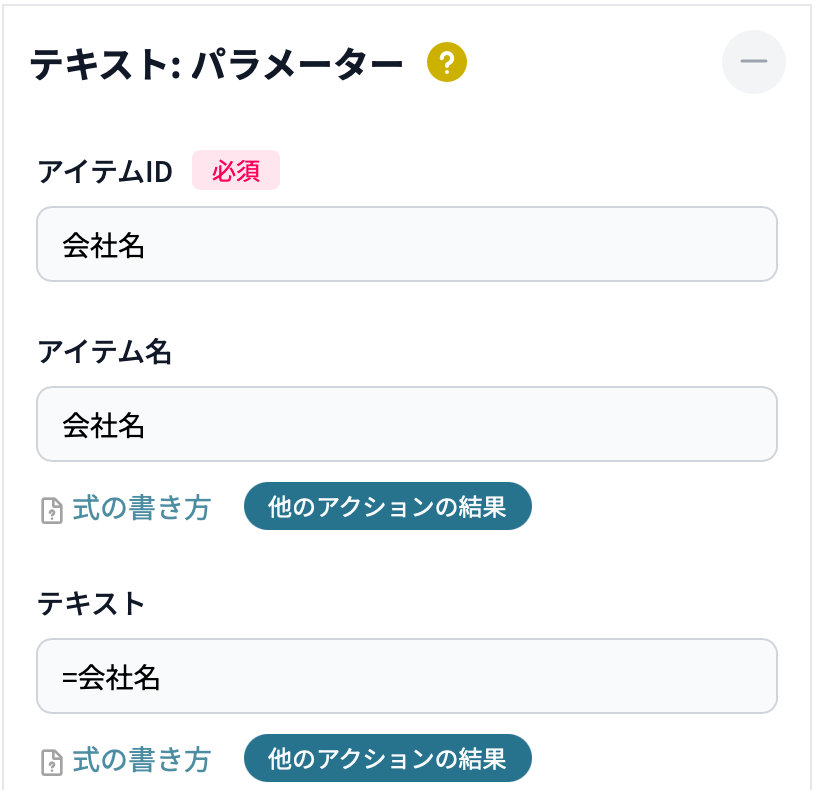 各テキストアイテムのパラメーターの[テキスト]には表示したいkintoneのフィールドを「=フィールドコード」の形で指定します。
