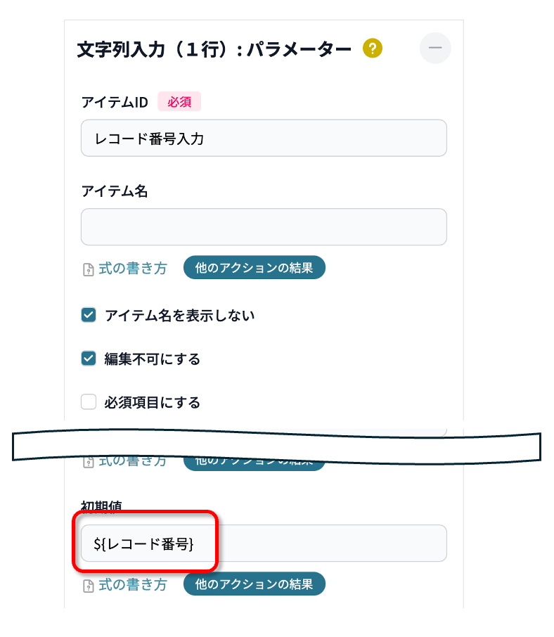 文字列入力(1行)にはkintoneのレコードのレコード番号を初期値として設定します。