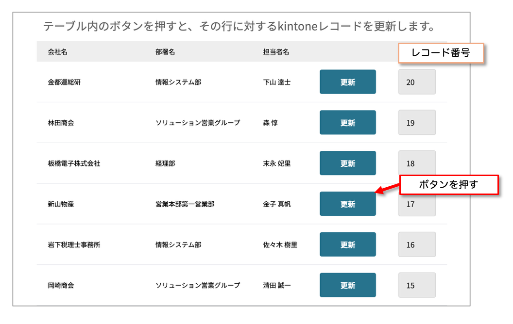 以上がエブリサイトのページ内処理で、シンプルテーブルに表示したkintoneのレコードについてボタンを押した行だけ更新する例でした。