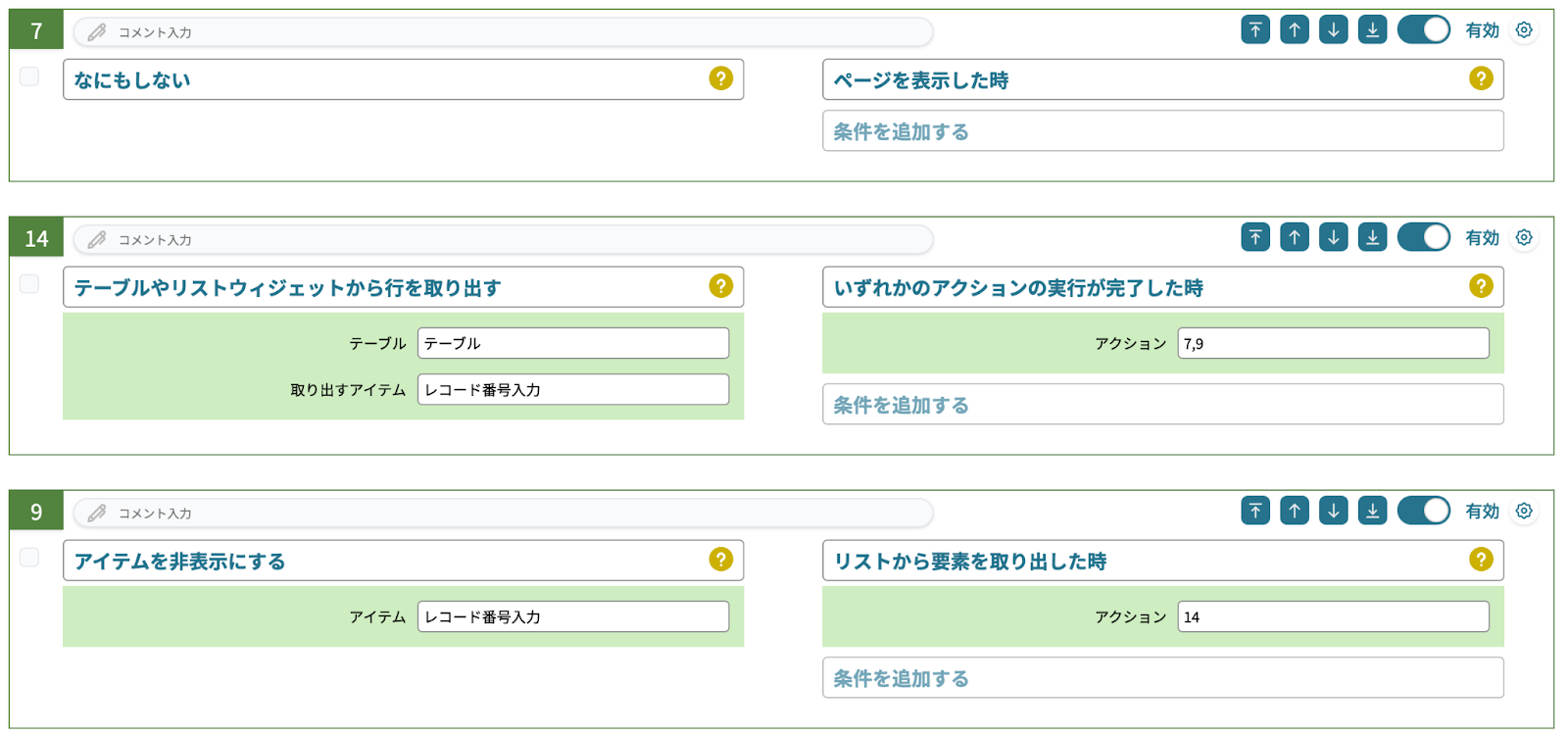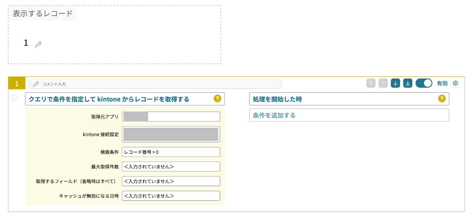 やること「kintone のレコードを更新する」、条件「ボタンを押した時」だけのアクションでも実現可能なのですが、操作するユーザーにわかりやすくするために「処理中表示を行う」「処理中表示を終了する」などを利用しておくと良いでしょう。