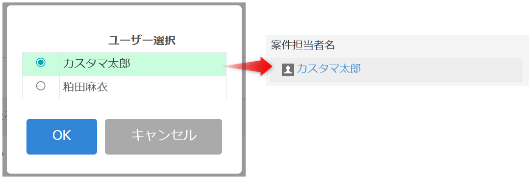 カスタマインでは、kintoneのユーザー選択フィールドの値をダイアログを表示してユーザーに選択させ、選択された値をレコードの一括更新などの様々な処理で利用できます。